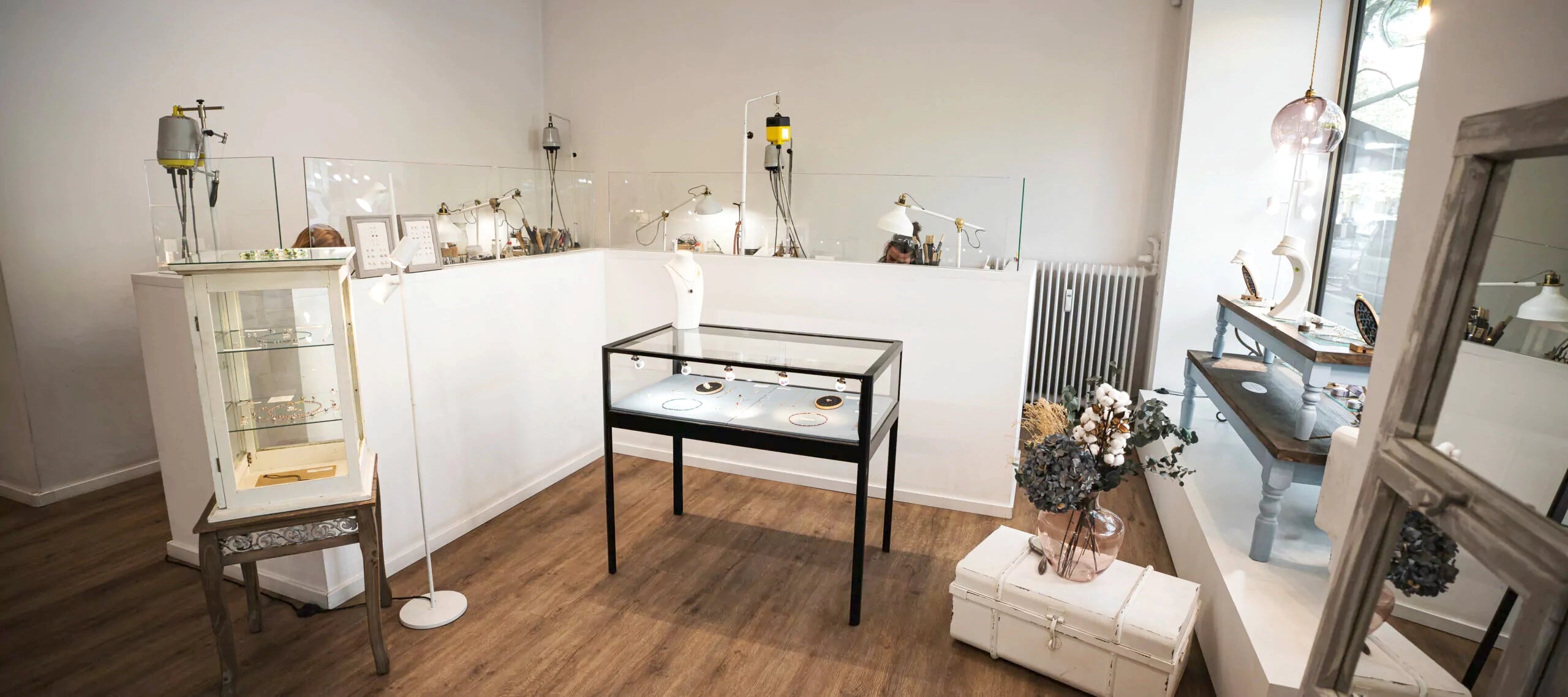 Mit viel Liebe zum Detail haben wir einen Raum erschaffen, der nicht nur eine würdige Leinwand für unsere Schmuckstücke bietet, sondern auch ein Gefühl von Offenheit und Leichtigkeit für unsere Kunden und Mitarbeiter vermittelt.