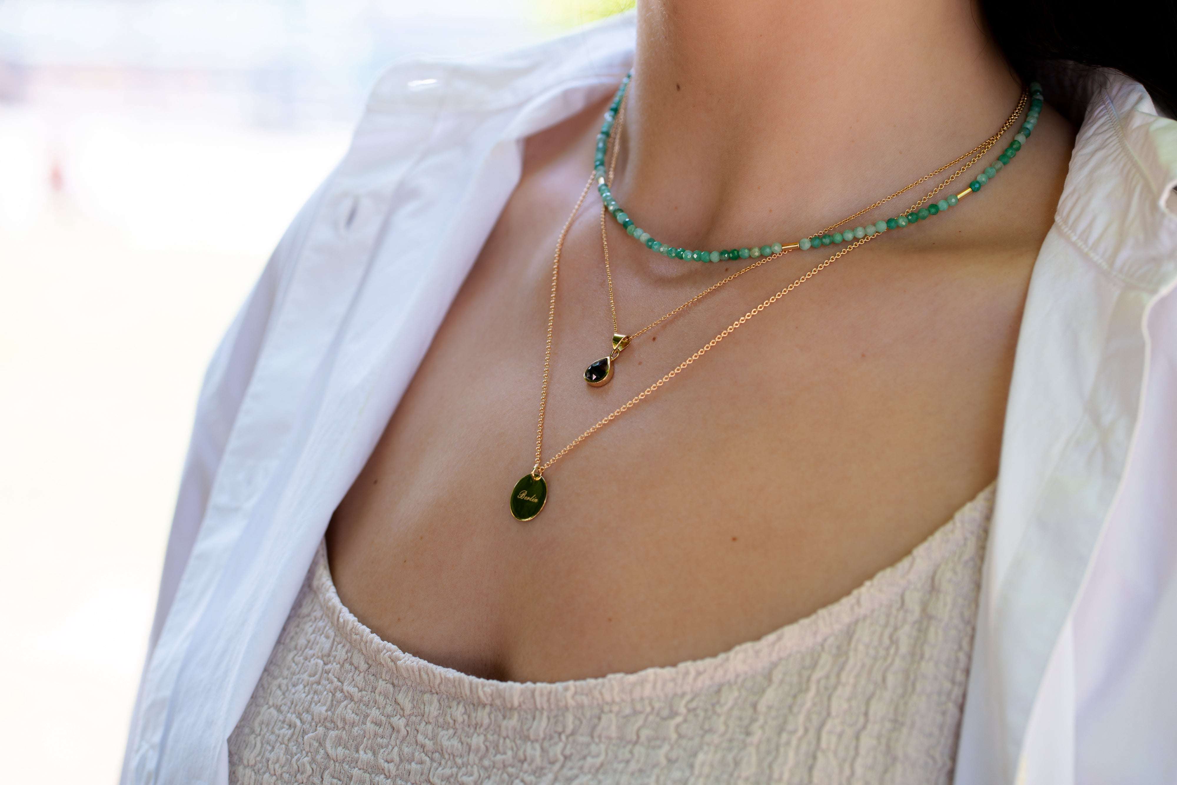 - Edelsteinkette (43 cm): Schmiegt sich elegant um den Hals.